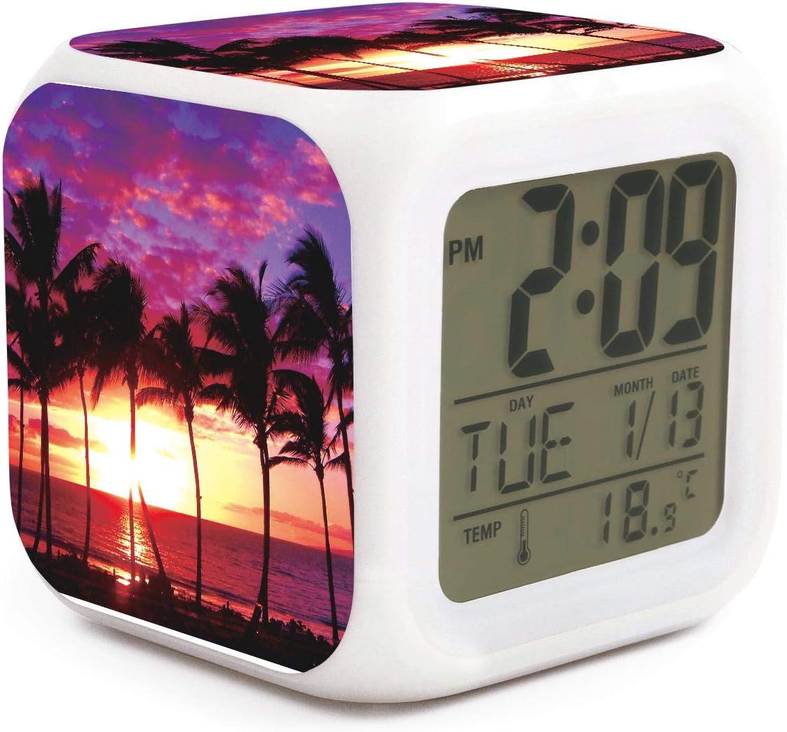 Amazon Com Woworldgoods Hawaii Sunset Palm Tree Pattern Theme Figure Funny 7 Colors Led Changing Digital Alarm Clock Cube Lcd Clock Home Decor Home Kitchen