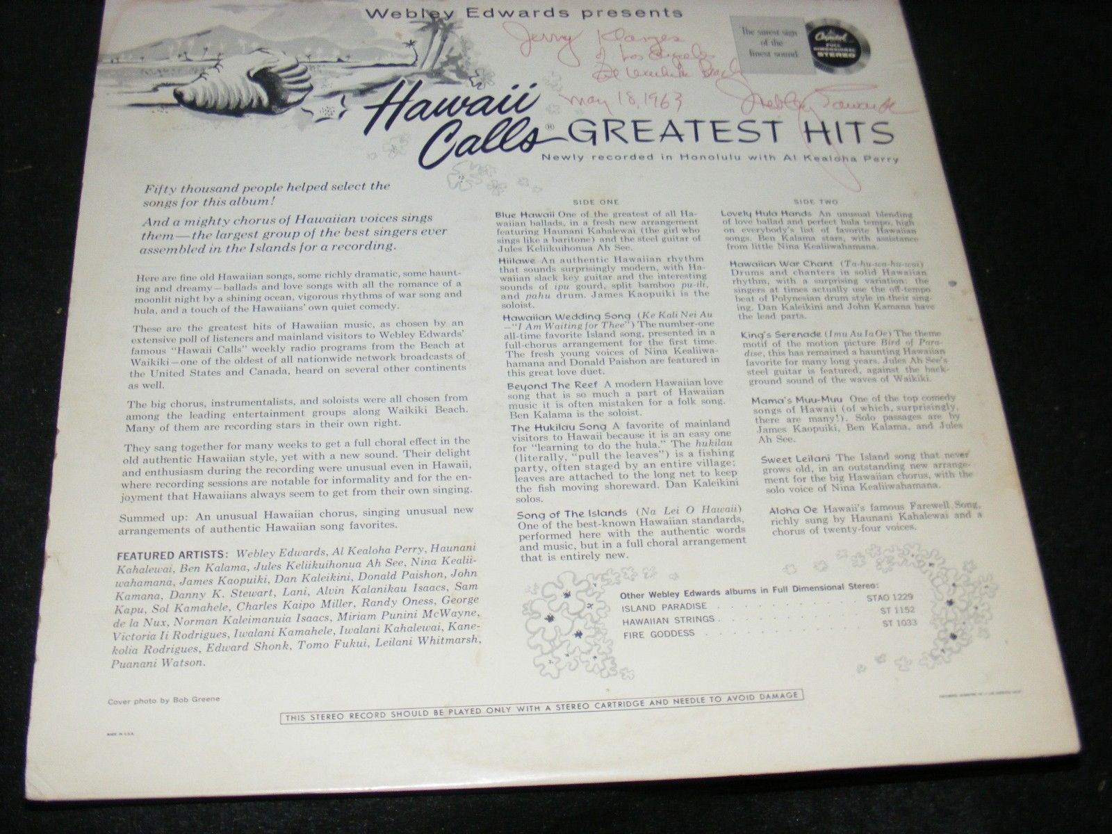 These previously issued songs were featured on a 5 disc 78 rpm album set decca album no. The hawaii calls deluxe 2 lp set capitol records st 2182 release year unknown 3 lp set is actually a repackaging of favorite instrumentals alfred apakas album golden voice of the islands and hawaii calls greatest hits the best of hawaii calls capitol records st1 141 release year unknown. Harry owens is the main performer for disc 1 as bing crosby is for disc 2 and frances langford backed by dick mcintire are for discs 3 and 4 while dick mcintire is the main performer for disc 5.