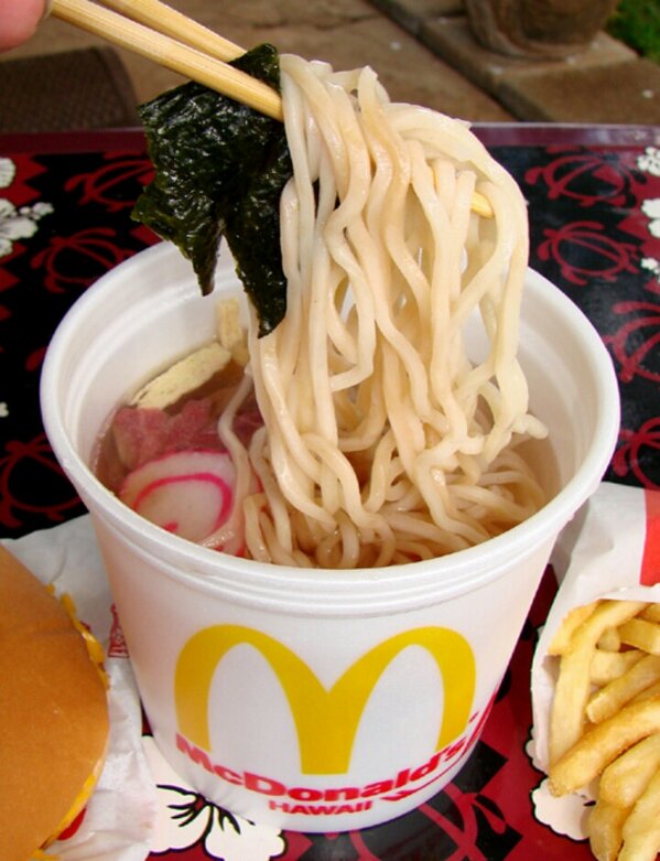 There are breakfast platters loaded with spam and portuguese sausage a dessert menu with hot haupia coconut pudding and taro pies fried apple pies only state where you can get the pies fried in the us and much more. There is an interesting story that ray kroc the founder of mcdonalds actually came down to hawaii and ate saimin with a local franchisee.
